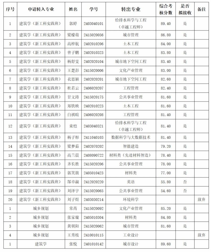 根据西建大〔2025〕23号《关于印发《西安建筑科技大学本 科生校内转专业实施办法》的通知》(以下简称“通知”)、西建大本科〔2025〕24号《关于做好2025年本科生校内转专业工作的通知》以及《建筑学院2025年本科生校内转专业工作实施方案》等文件要求,建筑学院于6月20日上午9:50-16:00组织进行了综合考核,现将综合考核成绩及拟接收结论予以公示,如有异议,请于2025年6月24日18:00前以书面形式反馈至建筑学院教学办(雁塔校区东楼231室),联系电话:029-82202041。