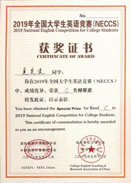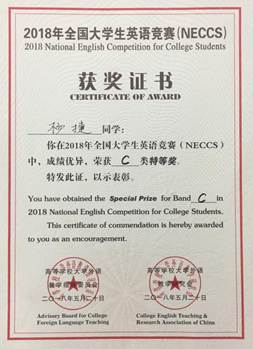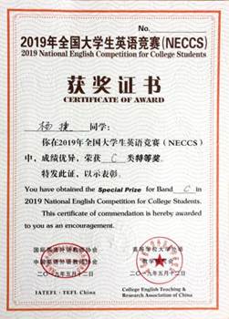 杨捷同学荣获2018年及2019年全国大学生英语竞赛特等奖,夏旻淏同学荣获2019年全国大学生英语竞赛特等奖。
