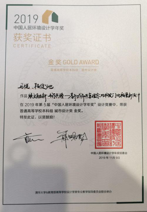 马悦同学团队荣获2019中国人居环境设计学年奖金奖。