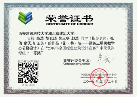 以张倩,俞天琦,王芳老师指导的高浩同学团队荣获2019年全国绿色建筑设计竞赛一等奖。