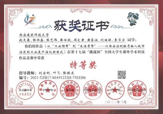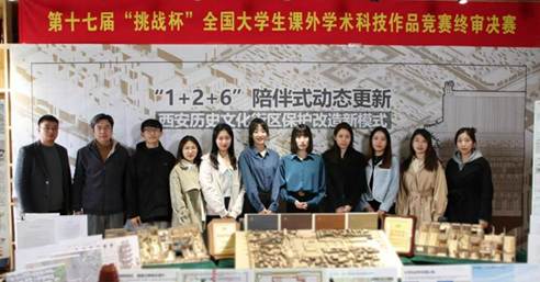2022年,第十七届“挑战杯”全国大学生课外学术科技作品竞赛,刘宗刚等老师指导的学生作品《从“工业锈带”到“生活秀带”——以西安为例探寻融入城市演进的工业遗产活化新模式》获得特等奖,李昊等老师指导的学生作品《“1+2+6”陪伴式动态更新——西安历史文化街区保护改造新模式》获得二等奖。