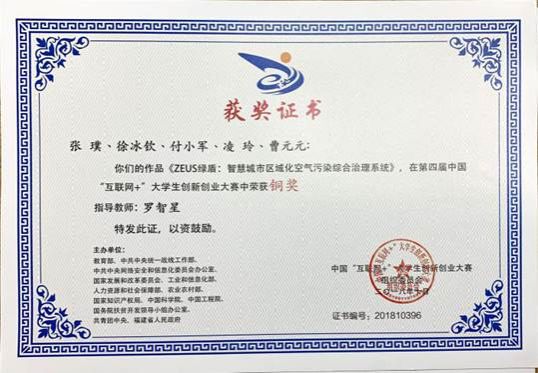 以罗智星老师指导的张璞同学团队荣获“建行杯”第四届“互联网+”大学生创新创业大赛铜奖。