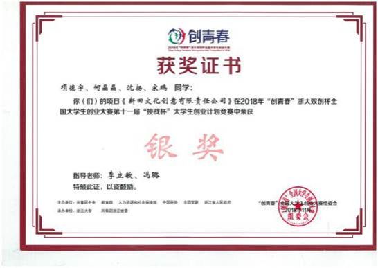 2018年,李立敏,冯璐老师指导的项德宇学生团队获 “创青春”浙大双创杯全国大学生创业大赛银奖。