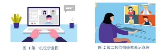 (2)“双机位”摆放要求:笔记本电脑(第一机位)从正面拍摄,放置在距离本人30cm左右处,手机(第二机位)从考生侧后方45°距离本人30cm左右处拍摄,确保第一机位和第二机位分别从考生面前和身后完整拍摄到考生全身、面试小组能够从第二机位清晰看到第一机位屏幕。第一机位和第二机位须两个账号分别登陆,效果图如下。