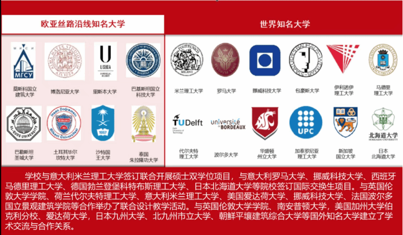 建筑学院积极开展国际交流与合作,持续推进国际化办学。目前拥有科技部111引智基地、陕西省绿色建筑“一带一路”联合实验室、教育部低碳建筑环境国际合作联合实验室、陕西省国际科技合作基地等平台,担任丝路国际建筑科技大学联盟、“低碳城市·社区·建筑”国际学术联盟理事长单位,持续联合世界知名院校开展国际合作交流,与数十所国外知名大学建立了学术交流与人才培养合作关系,举办了“丝路国际建筑科技大会”、“绿色建筑与低碳技术国际学术会议”、“西安建筑遗产保护国际会议”、“国际建协亚澳地区建筑遗产保护国际会议”等国际高水平学术会议。