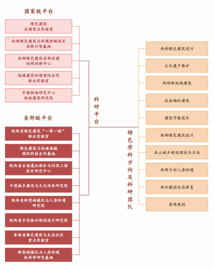建筑学院秉承学科优秀传统,始终扎根西部,服务全国,面向国际。以院士、杰青、优青、设计大师等国家级人才为引领,依托五个国家级平台、八个省部级平台,在国家自然科学基金重大项目、重点项目、重点国际合作项目、国家重点研发计划项目的支持下,瞄准学科国际前沿,重视学科基础研究,服务国家重大需求,逐步建设形成西部绿色建筑设计、文化遗产保护、西部新地域建筑、社会福祉建筑、建筑节能技术、西部生态城市规划与设计、本土城乡规划理论与方法、西部乡村人居环境、西北脆弱生态修复与景观规划等特色学科方向及科研团队。